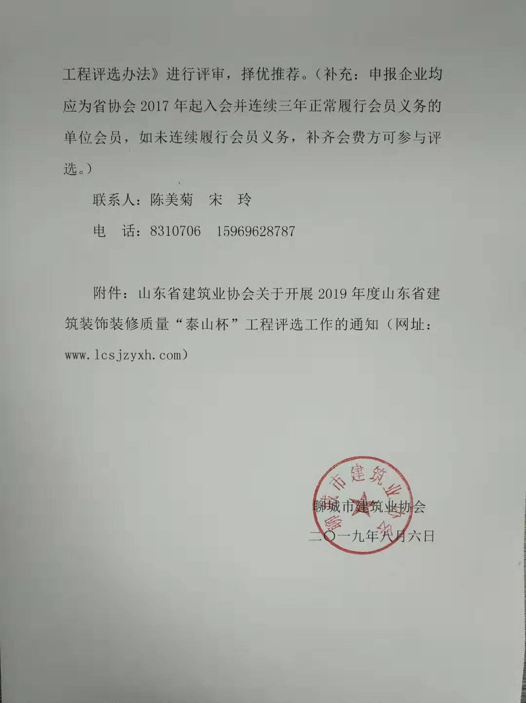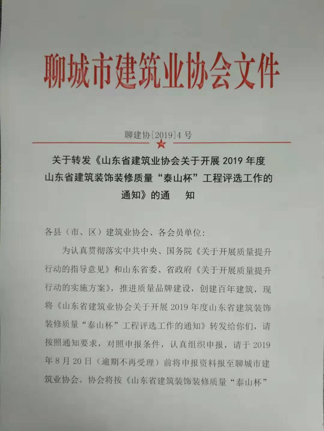 關(guān)于轉(zhuǎn)發(fā)《山東省建筑業(yè)協(xié)會(huì)關(guān)于開(kāi)展2019年度山東省建筑裝飾裝修 質(zhì)量“泰山杯”工程評(píng)選工作的通知》的通知