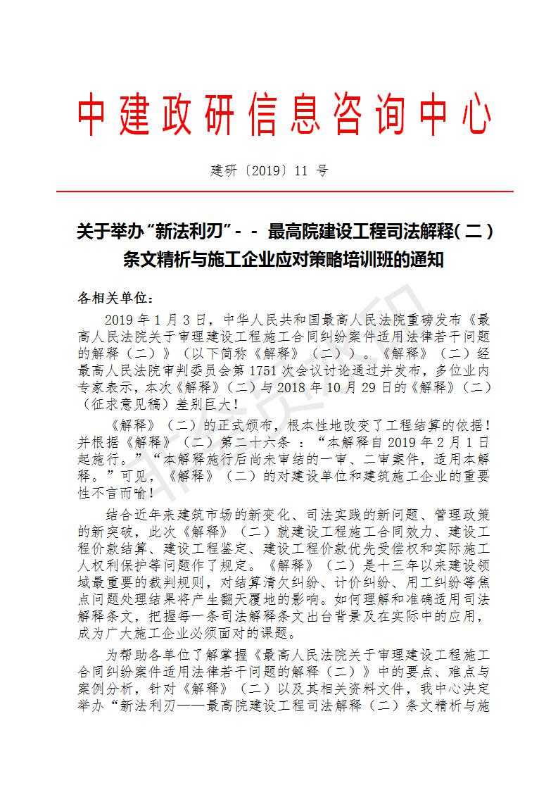 關(guān)于舉辦“新法利刃”—最高院建設(shè)工程司法解釋(二) 條文精析與施工企業(yè)應(yīng)對策略培訓(xùn)班的通知
